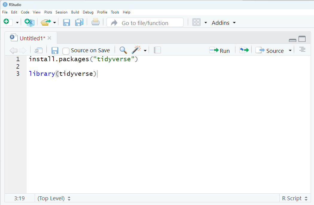 Untuk melakukan instalasi paket tidyverse dapat menjalankan perintah install.package("tidyverse")lalu jalankan perintah library(tidyverse) seperti gambar dibawah untuk menggunakan paket tersebut.